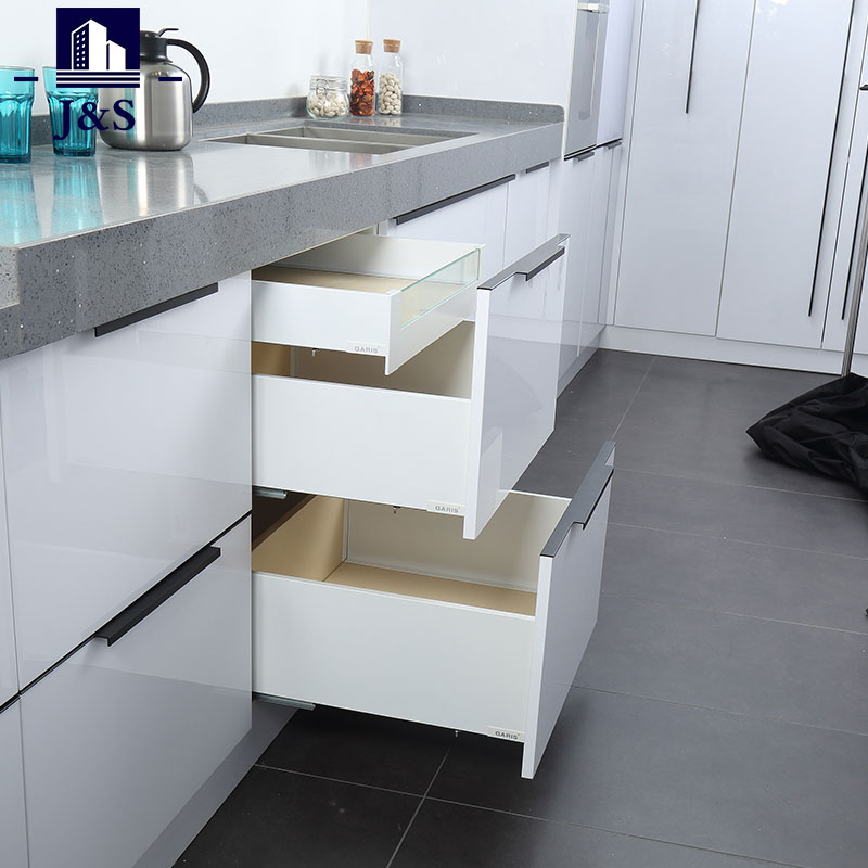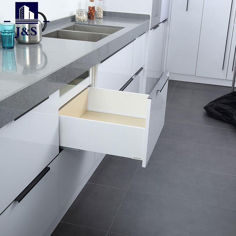 Танка кутија за фиоке беле боје је популарна широм света. Пуно проширење Кухињски клизач за меко затварање је трослојна челична бочна плоча са уграђеним пригушењем, такође позната као луксузно пумпање за пригушивање. То је најбољи хардверски додатак који се користи у целој кухињи, орману, фиокама итд. Чврстији је и издржљивији од троделне водилице.