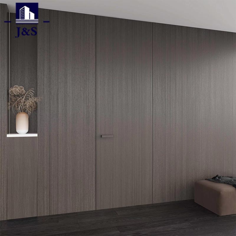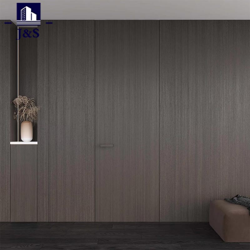 Овај сет скривених врата по мери целе куће приказује врхунски дизајн целе куће по мери, неприметно се уклапајући у модеран животни простор. Врата имају софистицирану завршну обраду тамног дрвета која се савршено уклапа са тамним подовима и минималистичким зидним акцентима, подижући укупну естетику уз ненаглашени луксуз. Врхунац лежи у његовом изврсном хардверу: елегантна, геометријска квака на вратима има мат црну текстуру са прецизним детаљима, нудећи удобно држање и додир индустријске елеганције. У међувремену, скривена шарка за тешке услове рада обезбеђује ултра-углађен рад док остаје потпуно скривена, отелотворујући и издржљивост и минималистичку генијалност. Скројен за младе власнике кућа који теже споју стила и функционалности, овај дизајн елиминише опструктивне оквире врата, стварајући отворено, чисто окружење. То је врхунски избор за модерне станове, спајајући беспрекорну визуелну интеграцију са висококвалитетним занатским умећем како би се редефинисао савремени живот.